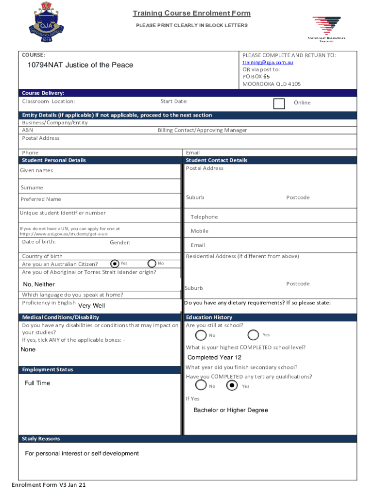Training Course Enrollment Form PLEASE PRINT CLEARLY IN BLOCK LETTERSCOURSE:PLEASE COMPLETE AND RETURN TO: training×qja.com.AU OR via post to: PO BOX 65 MOOROOPNA QLD 410510794NAT Justice of the