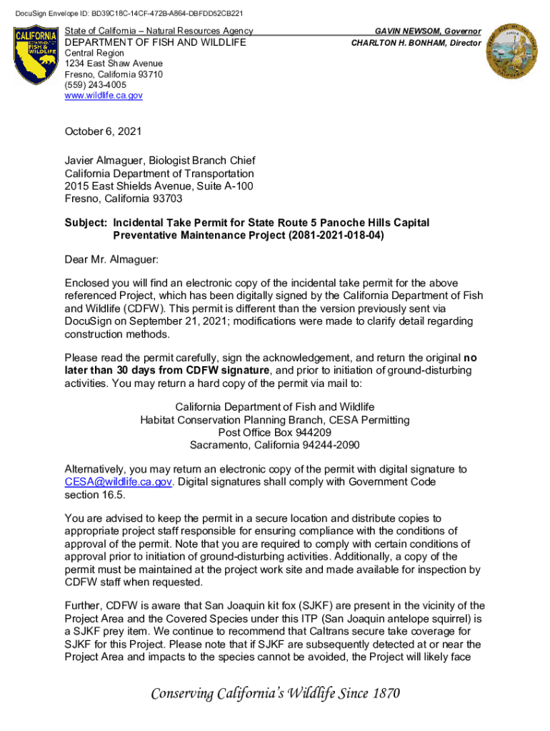 DocuSign Envelope ID: BD39C18C14CF472BA864DBFDD52CB221 5F29F421BF804B558A1E5EEE48BB6645State of California Natural Resources AgencyDEPARTMENT OF FISH AND WILDLIFEGAVIN NEWSOM, Governor CHARLTON H.