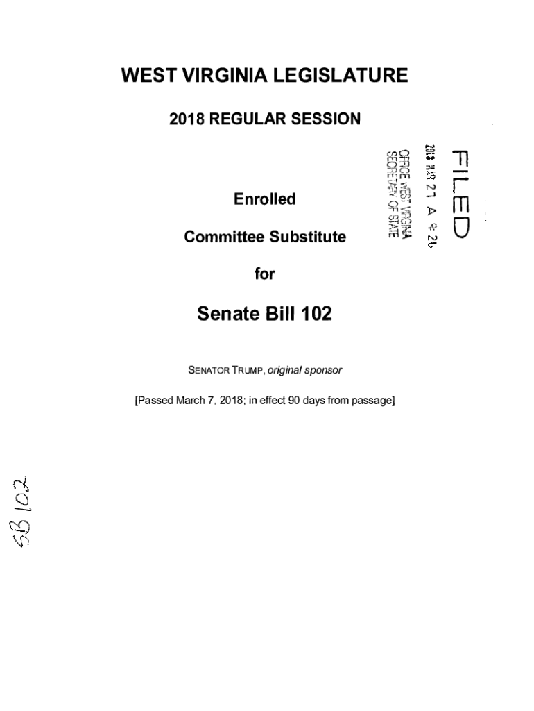 WEST VIRGINIA LEGISLATURE 2018 REGULAR SESSION e::::1W,9c)!\'Tl enrolled Committee Substitute;! ,.;\”.1;J i\'i\'\'l. y; (f) ::JJ_\'.j (;); m:p:for Senate Bill 102 SENATOR TRUMP, original sponsor×Passed