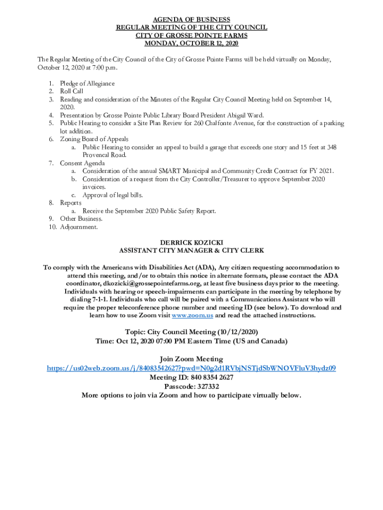 AGENDA OF BUSINESS REGULAR MEETING OF THE CITY COUNCIL CITY OF GROSS POINT FARMS MONDAY, OCTOBER 12, 2020, The Regular Meeting of the City Council of the City of Gross Point Farms will be held virtually