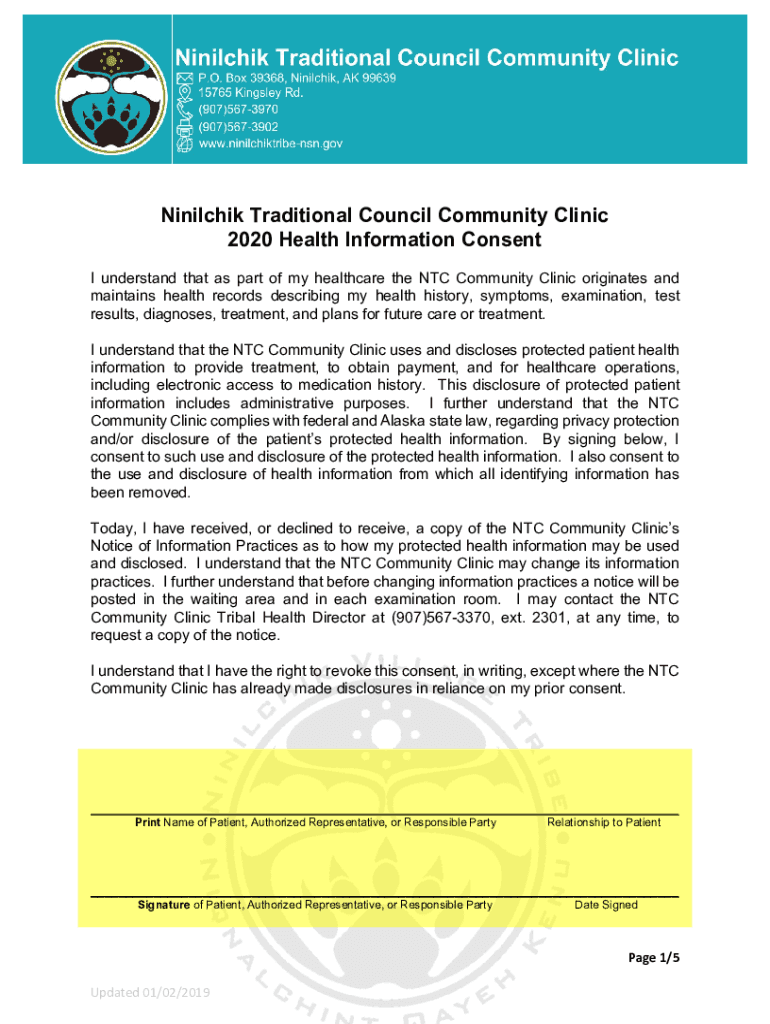 Ninilchik Traditional Council Community Clinic 2020 Health Information Consent I understand that as part of my healthcare the NTC Community Clinic originates and maintains health records describing