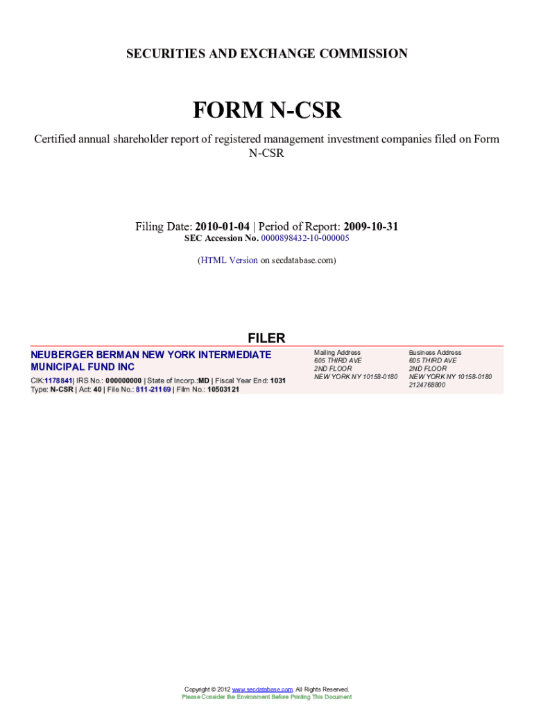 Get the free NEUBERGER BERMAN NEW YORK INTERMEDIATE MUNICIPAL FUND INC (Form. Accession Number
