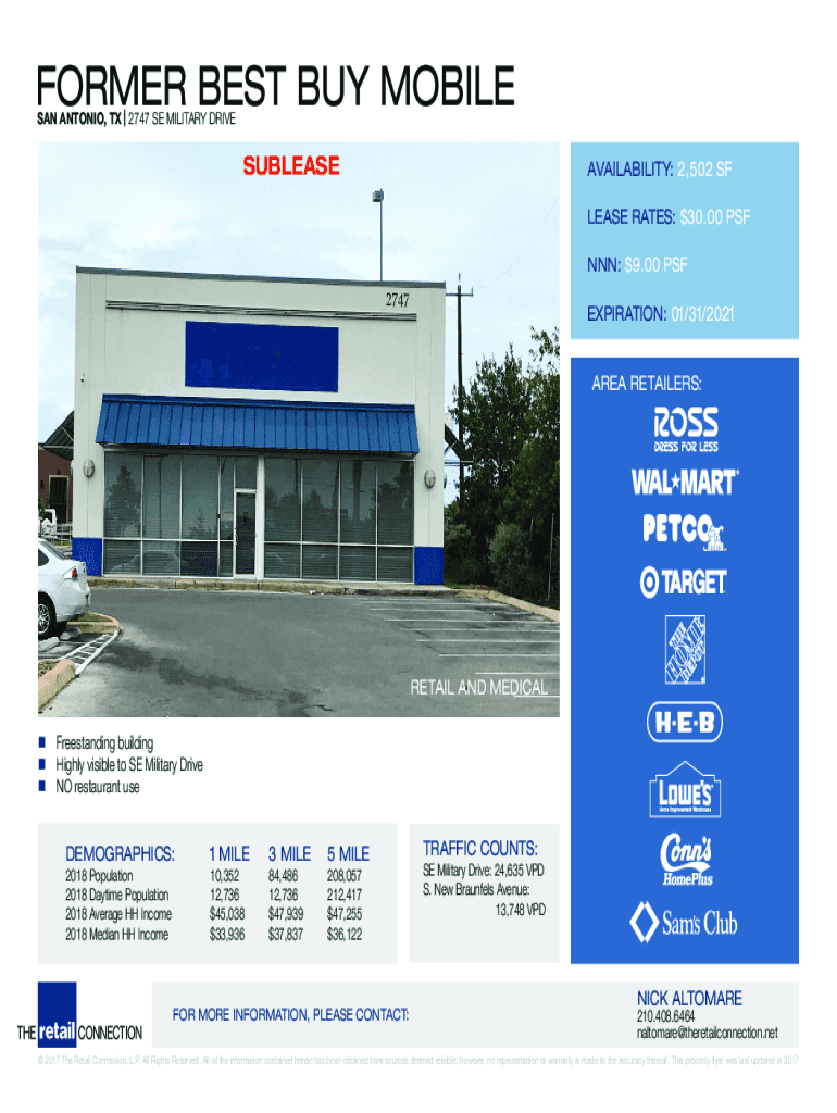 FORMER BEST BUY MOBILE SAN ANTONIO, TX | 2747 SE MILITARY DRIVESUBLEASEAVAILABILITY: 2,502 SF LEASE RATES: $30.00 PSF NNN: $9.00 PSF EXPIRATION: 01/31/2021 AREA RETAILERS:RETAIL AND MEDICAL n Freestanding