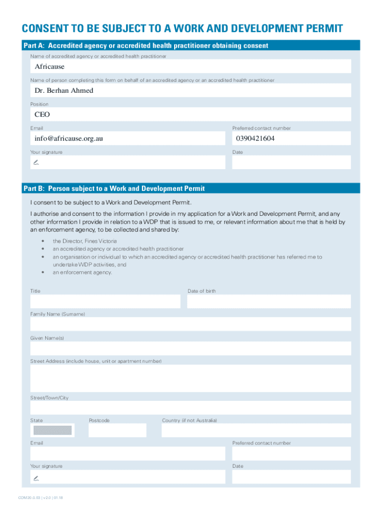 INFORMATION STATEMENT/CONSENT FORM WORK AND DEVELOPMENT Permitted consent form must be completed by an accredited agency or accredited health practitioner and the eligible person when applying for