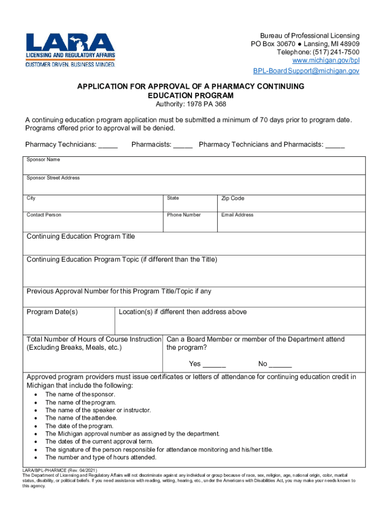 Bureau of Professional Licensing PO Box 30670 Lansing, MI 48909 Telephone: (517) 2417500 www.michigan.gov/bpl Billboard Support×Michigan.application FOR APPROVAL OF A PHARMACY CONTINUING EDUCATION