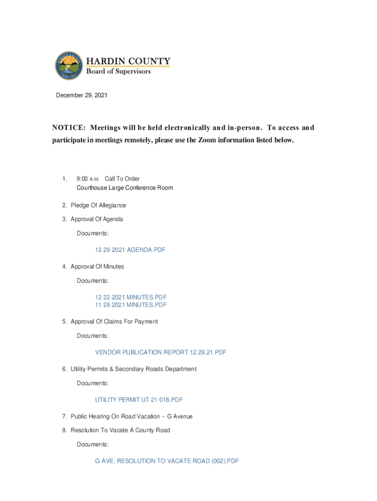 December 29, 2021NOTICE: Meetings will be held electronically and unperson. To access and participate in meetings remotely, please use the Zoom information listed below.1.9:00 A.M. Call To Order Courthouse