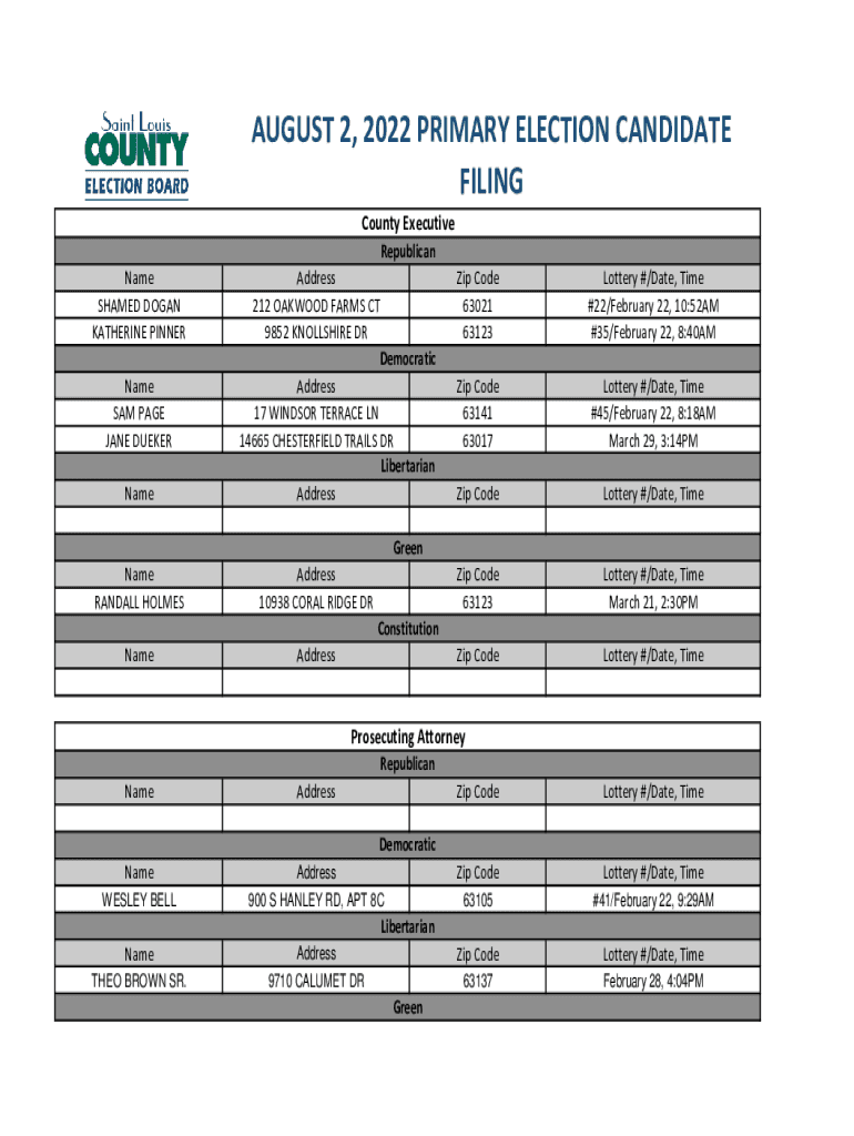 AUGUST 2, 2022, PRIMARY ELECTION CANDIDATE FILING County Executive Republican Name SHAMED DOGAN KATHERINE INNER Name SAM PAGE JANE DUELER Headdress 212 LAKEWOOD FARMS CT 9852 KNOLLSHIRE DR Democratic