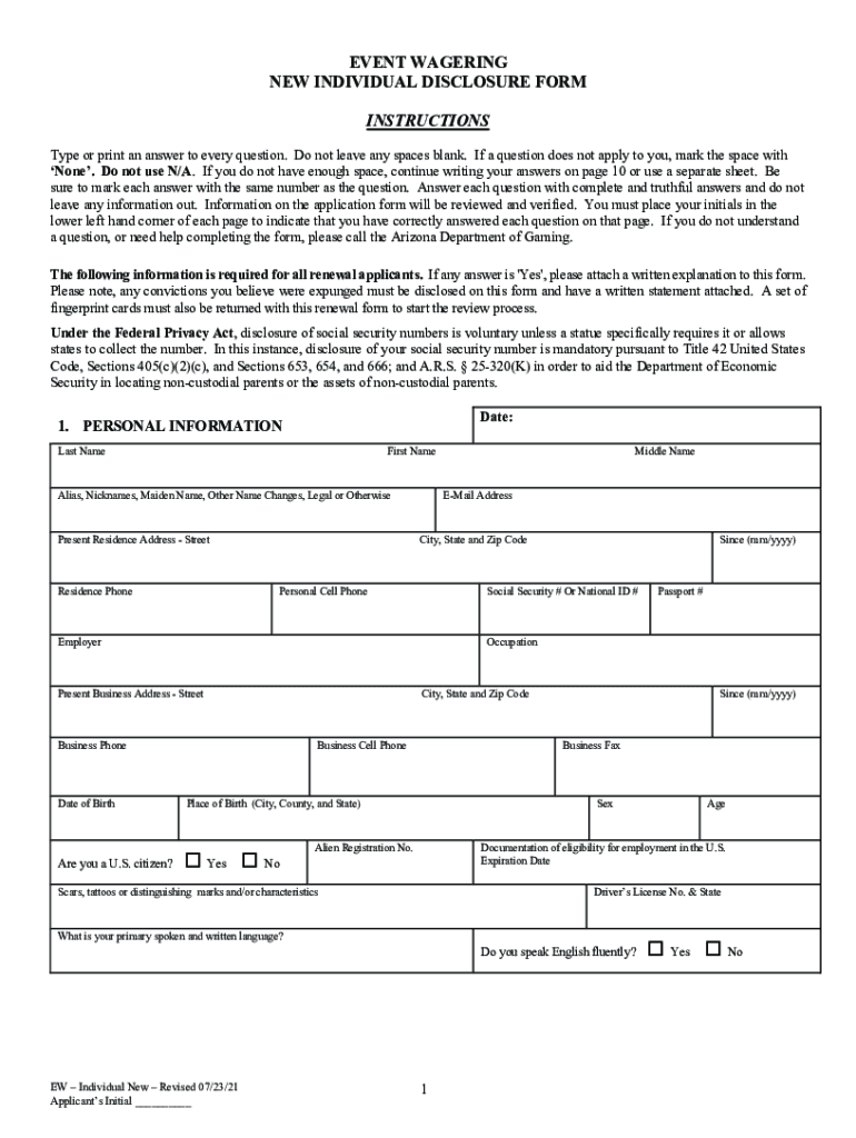 Arizona Department of Gaming Event Wagering Individual Disclosure Form Arizona Department of Gaming 1110 W. Washington #450 Phoenix, AZ 85007 (602) 7714263Event Wagering Employee APPLICATION FEE: