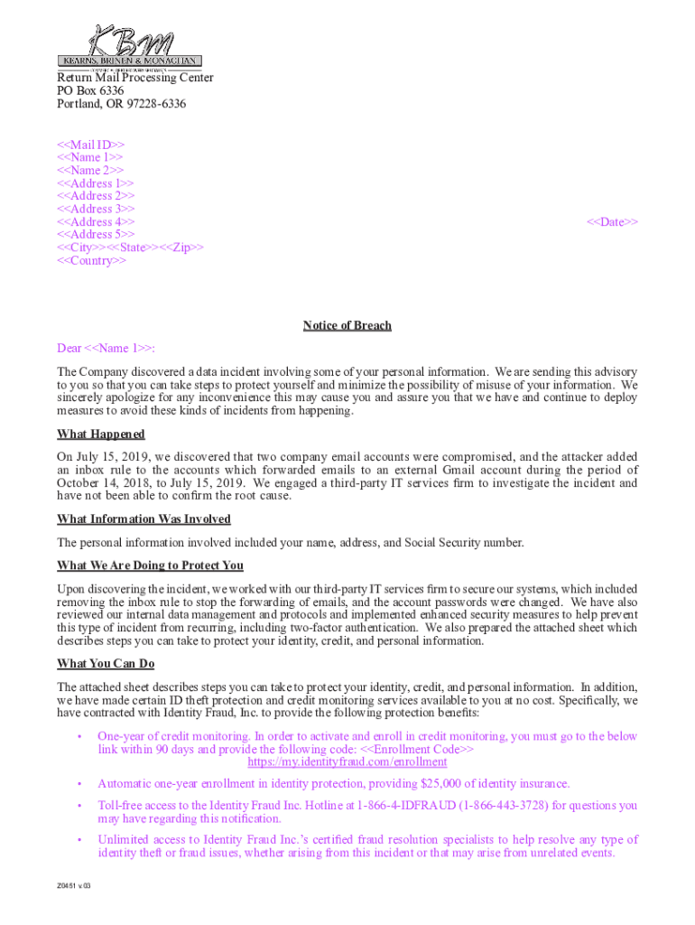 Get the free Notice of Breach Dear : The Company discovered a ...