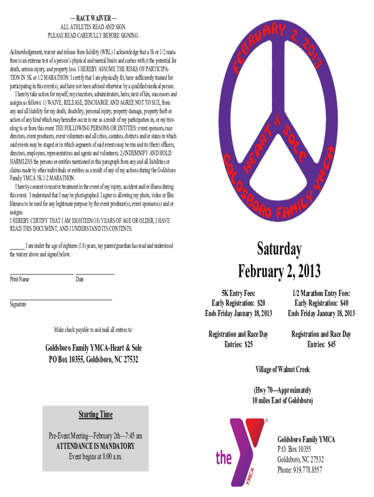 RACE WAIVER ALL ATHLETES READ AND SIGN. PLEASE READ CAREFULLY BEFORE SIGNING. Acknowledgement, waiver and release from liability (NRL) I acknowledge that a 5k or 1/2 marathon is an extreme test of