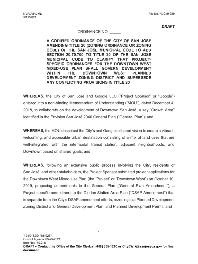 NSF:MVP:JMD 5/11/2021File No. PDC19039DRAFT ORDINANCE NO. ___ A CODIFIED ORDINANCE OF THE CITY OF SAN JOSE AMENDING TITLE 20 (ZONING ORDINANCE OR ZONING CODE) OF THE SAN JOSE MUNICIPAL CODE TO ADD