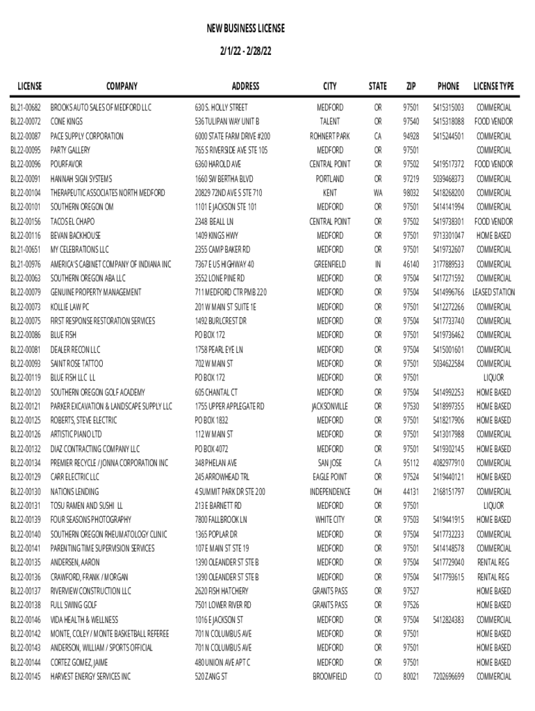 NEW BUSINESS LICENSE 2/1/22 2/28/22 LICENSECOMPANYADDRESSCITYSTATEZIPPHONELICENSE TYPEMEDFORDOR975015415315003COMMERCIALTALENTOR975405415318088FOOD VENDORROHNERT PARKCA949285415244501COMMERCIALMEDFORDOR97501CENTRAL