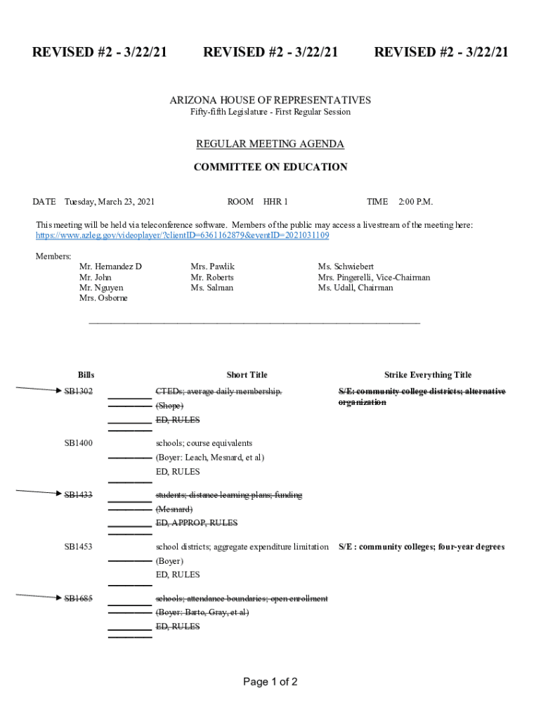REVISED #2 3/22/21REVISED #2 3/22/21REVISED #2 3/22/21ARIZONA HOUSE OF REPRESENTATIVES Fifty fifth Legislature First Regular SessionREGULAR MEETING AGENDA COMMITTEE ON EDUCATION DATE Tuesday, March