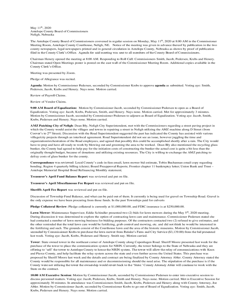 May 11th, 2020 Antelope County Board of Commissioners Neigh, Nebraska The Antelope County Board of Commissioners convened in regular session on Monday, May 11th, 2020 at 8:00 AM in the Commissioner