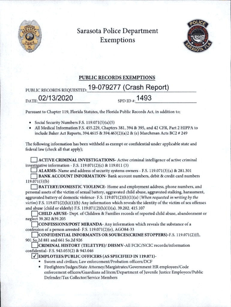 I Sarasota Police Department ExemptionsPUBLIC RECORDS EXEMPTIONS Public Records REQUESTED: DATE:02/13/202019079277 (Crash Report) SPD ID #:1493 Pursuant to Chapter 119, Florida Statutes, the Florida