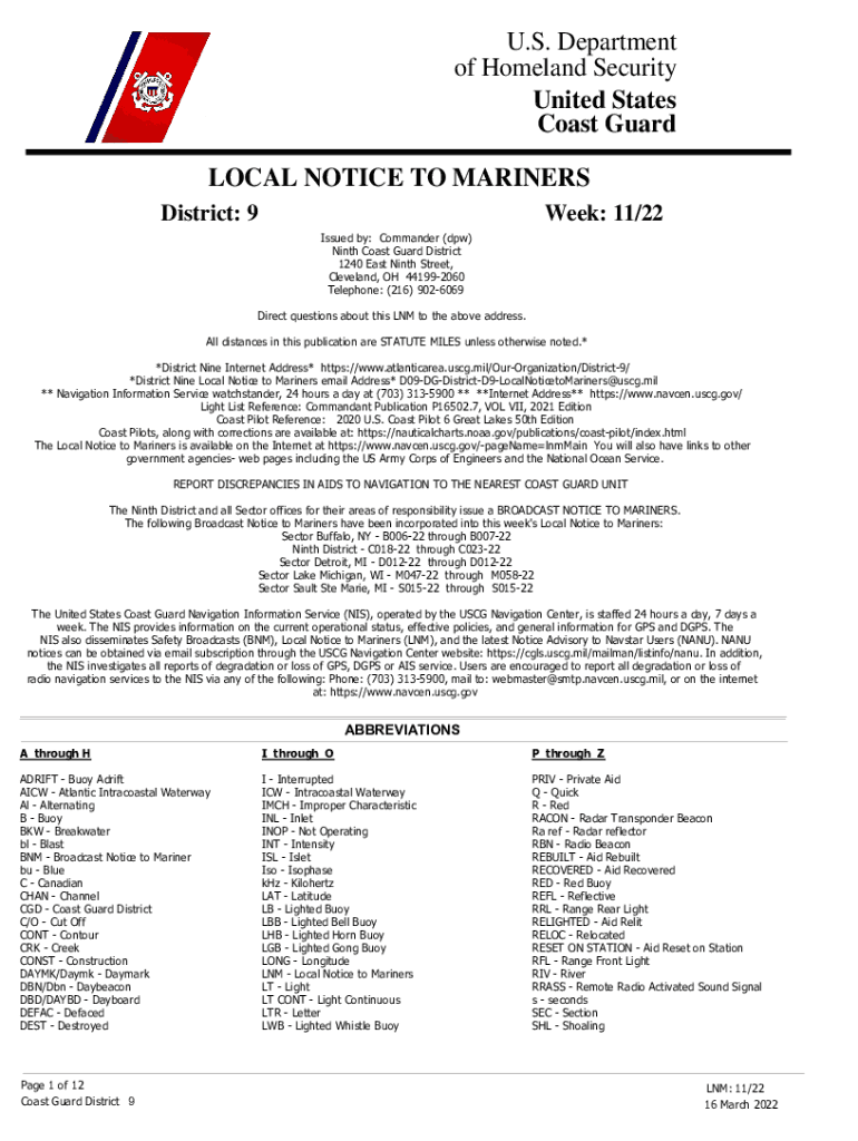 U.S. Department of Homeland Security United States Coast Guard LOCAL NOTICE TO MARINERS District: 9Week: 11/22 Issued by: Commander (DPW) Ninth Coast Guard District 1240 East Ninth Street, Cleveland,