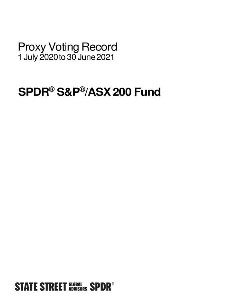 Proxy Voting Record 1 July 2020 to 30 June 2021SPDR S&P/ASX 200 Undone Summary ReportReporting Period: 07/01/2020 to 06/30/2021 Location(s): All Locations Institution Account(s): SPUR S&P/ ASX 200