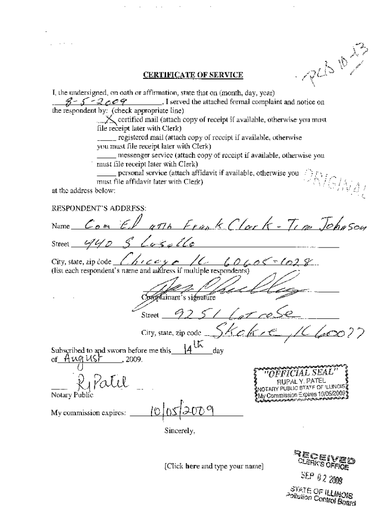 CERTIFICATE OF SERVICE I, the undersigned, on oath or affirmation, state that on (month, day, year) c I served the attached formal complaint and notice on 1 2 2 the respondent by: (check appropriate