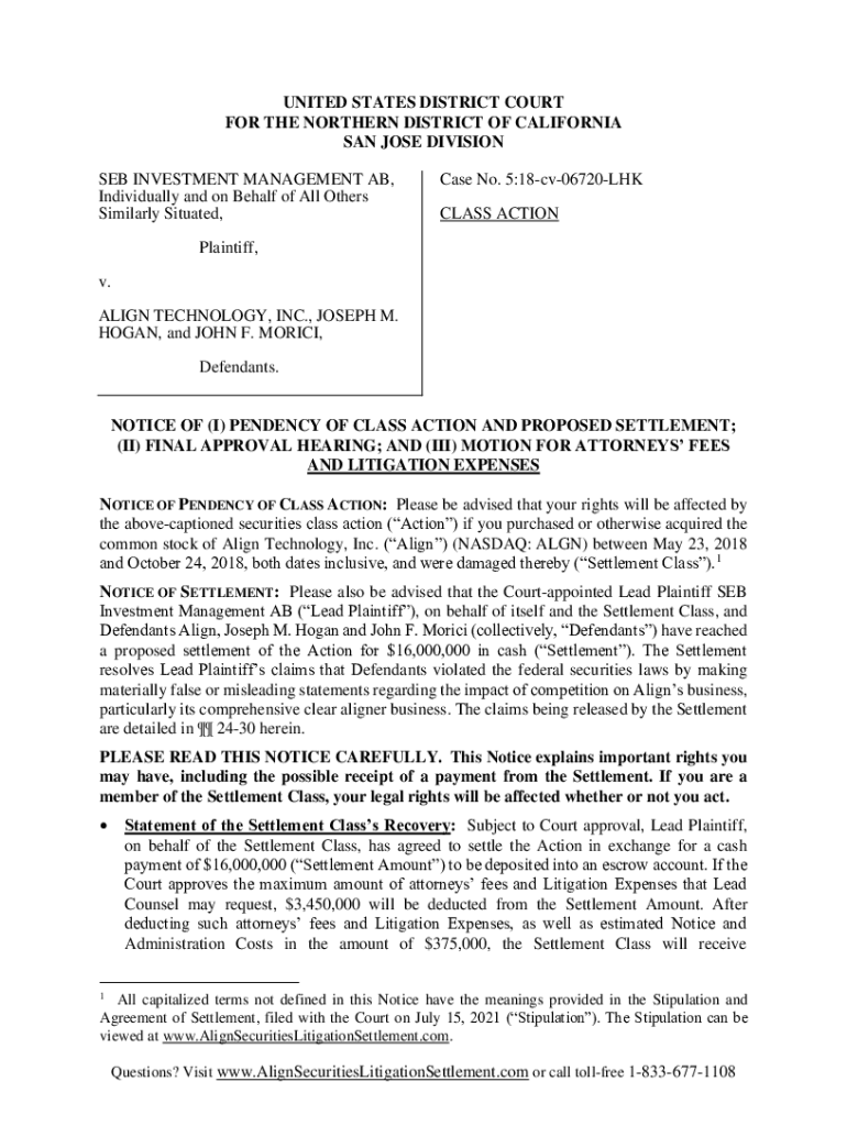 UNITED STATES DISTRICT COURT FOR THE NORTHERN DISTRICT OF CALIFORNIA SAN JOSE DIVISION SEB INVESTMENT MANAGEMENT AB, Individually and on Behalf of All Others Similarly Situated, Case No. 5:18cv06720LHK