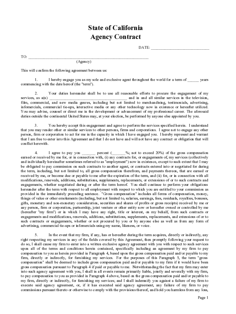State of California Agency Contract DATE: ___ TO: ___ (Agency) This will confirm the following agreement between us: 1. I hereby engage you as my sole and exclusive agent throughout the world for