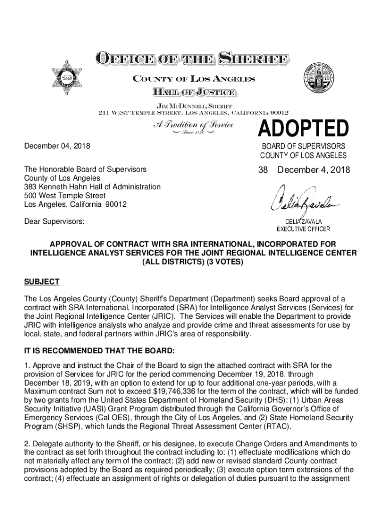ADOPTED December 04, 2018BOARD OF SUPERVISORS COUNTY OF Los Angeles Honorable Board of Supervisors County of Los Angeles 383 Kenneth Hahn Hall of Administration 500 West Temple Street Los Angeles,