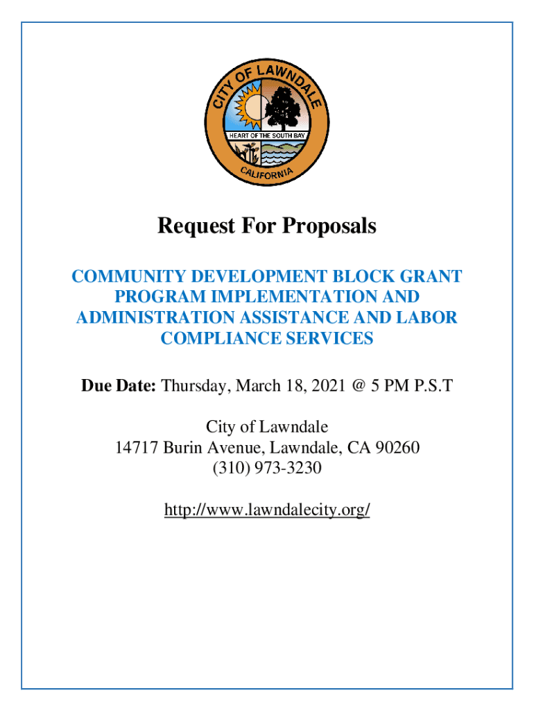 Request For Proposals COMMUNITY DEVELOPMENT BLOCK GRANT PROGRAM IMPLEMENTATION AND ADMINISTRATION ASSISTANCE AND LABOR COMPLIANCE SERVICES Due Date: Thursday, March 18, 2021 × 5 PM P.S.T City of