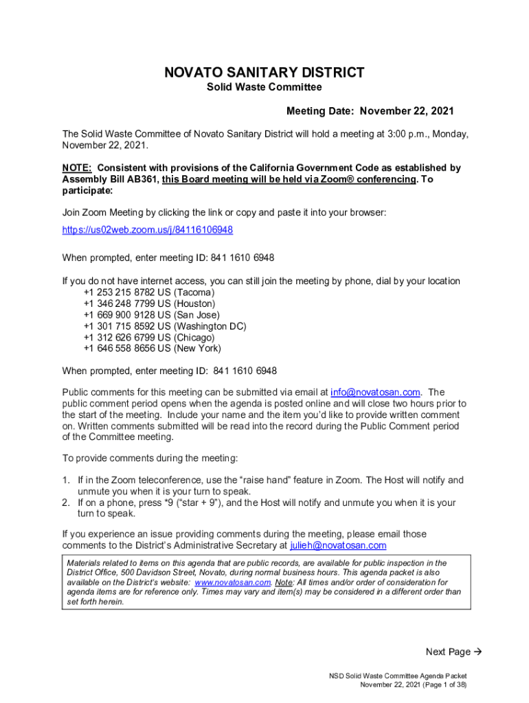 NOVATO SANITARY DISTRICT Solid Waste CommitteeMeeting Date: November 22, 2021, The Solid Waste Committee of Novato Sanitary District will hold a meeting at 3:00 p.m., Monday, November 22, 2021. NOTE: