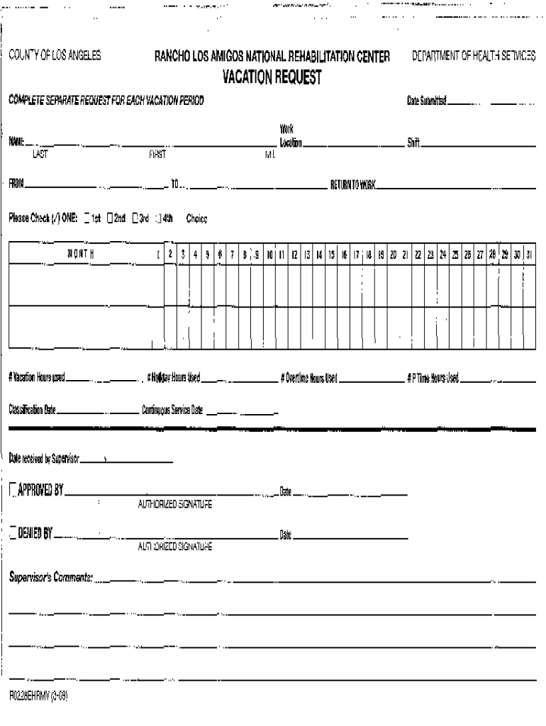 COUNTY OF LOS ANGELESRANCHO LOS AMIGOS NATIONAL REHABILITATION CENTER.DEPARTMENT OF HEALTH SERVICESVACATION REQUEST Date Submitted _ _ _ _ _ _ _ _ __COMPLETE SEPARATE REQUEST FOR EACH VACATION PERIODWork