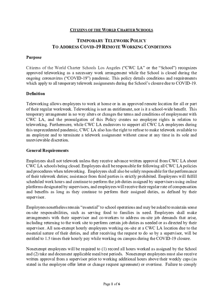 CITIZENS OF THE WORLD CHARTER SCHOOLSTEMPORARY TELEWORK POLICY TO ADDRESS COVID-19 REMOTE WORKING CONDITIONS Purpose Citizens of the World Charter Schools Los Angeles (CWC LA or the School) recognizes