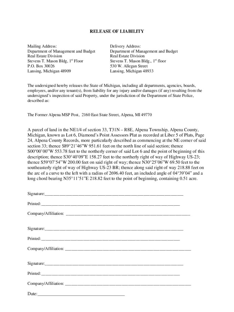 RELEASE OF LIABILITY Mailing Address: Department of Management and Budget Real Estate Division Stevens T. Mason Bldg, 1st Floor P.O. Box 30026 Lansing, Michigan 48909Delivery Address: Department of