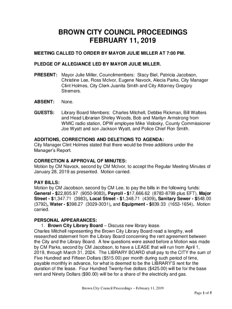 Get the free BROWN CITY COUNCIL PROCEEDINGS - ci brown-city mi