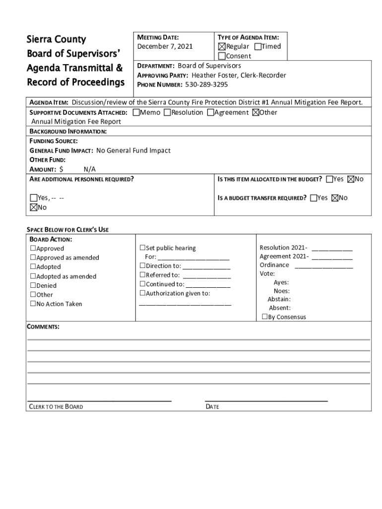 Sierra Courtyard of SupervisorsAgenda Transmittal record of ProceedingsMEETING DATE: December 7, 2021TYPE OF AGENDA ITEM: Regular Timed Consent DEPARTMENT: Board of Supervisors APPROVING PARTY: Heather