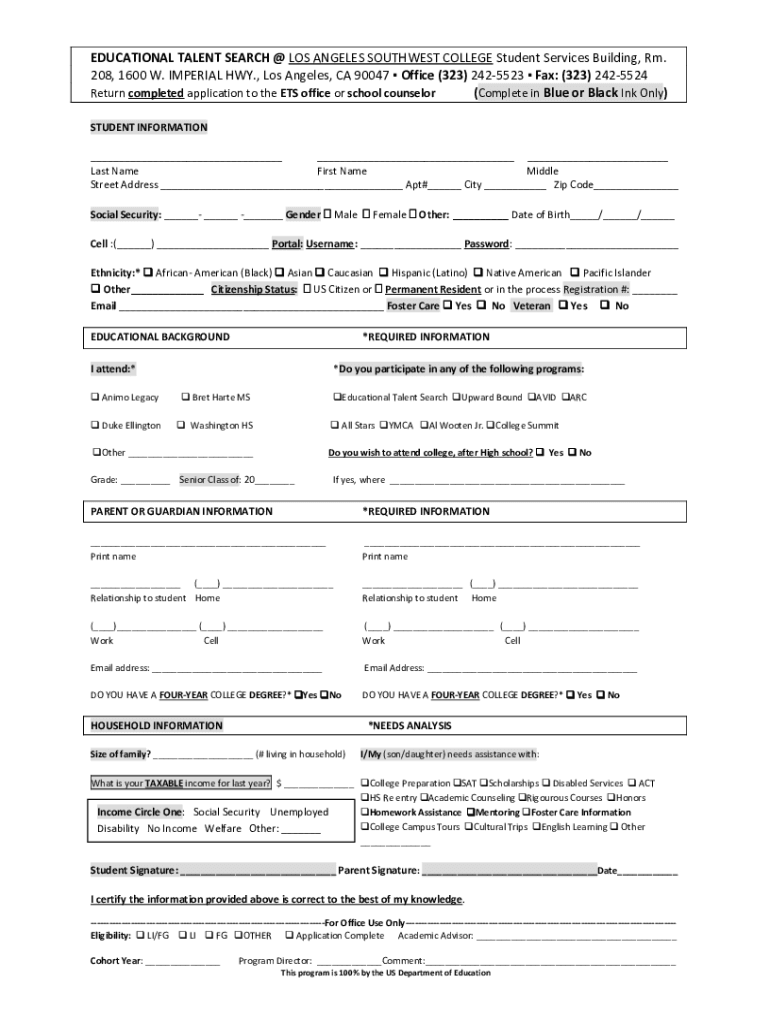 EDUCATIONAL TALENT SEARCH @ LOS ANGELES SOUTHWEST COLLEGE Student Services Building, Rm. 208, 1600 W. IMPERIAL HWY., Los Angeles, CA 90047 Office (323) 2425523 Fax: (323) 2425524 Return completed