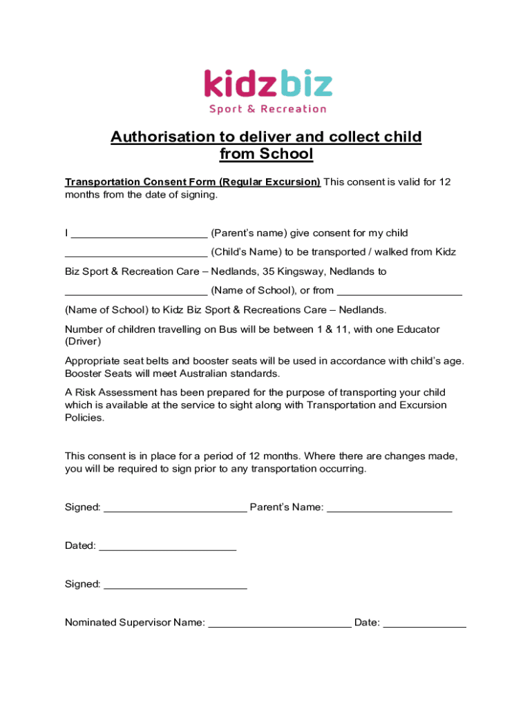 Authorization to deliver and collect child from School Transportation Consent Form (Regular Excursion) This consent is valid for 12 months from the date of signing. I ___ (Parents name) give consent