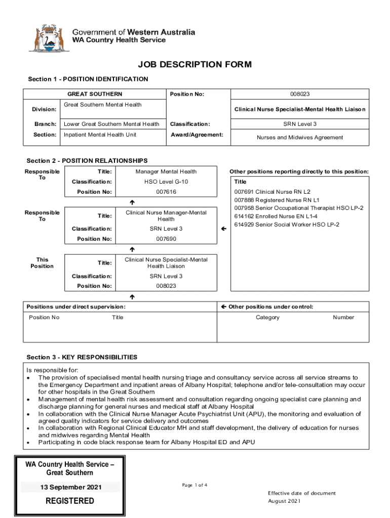 JOB DESCRIPTION FORM Section 1 POSITION IDENTIFICATION GREAT SOUTHERN Division:Position No:008023Great Southern Mental HealthClinical Nurse SpecialistMental Health Liaison Branch:Lower Great Southern