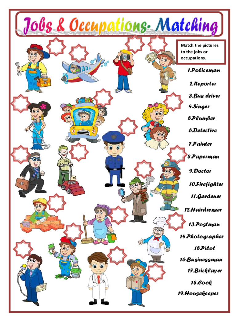 Match the pictures to the jobs or occupations.1. Policeman 2. Reporter 3. Bus driver 4. Singer 5. Plumber 6. Detective 7. Painter 8. Paper man 9. Doctor 10. Firefighter 11. Gardener 12. Hairdresser