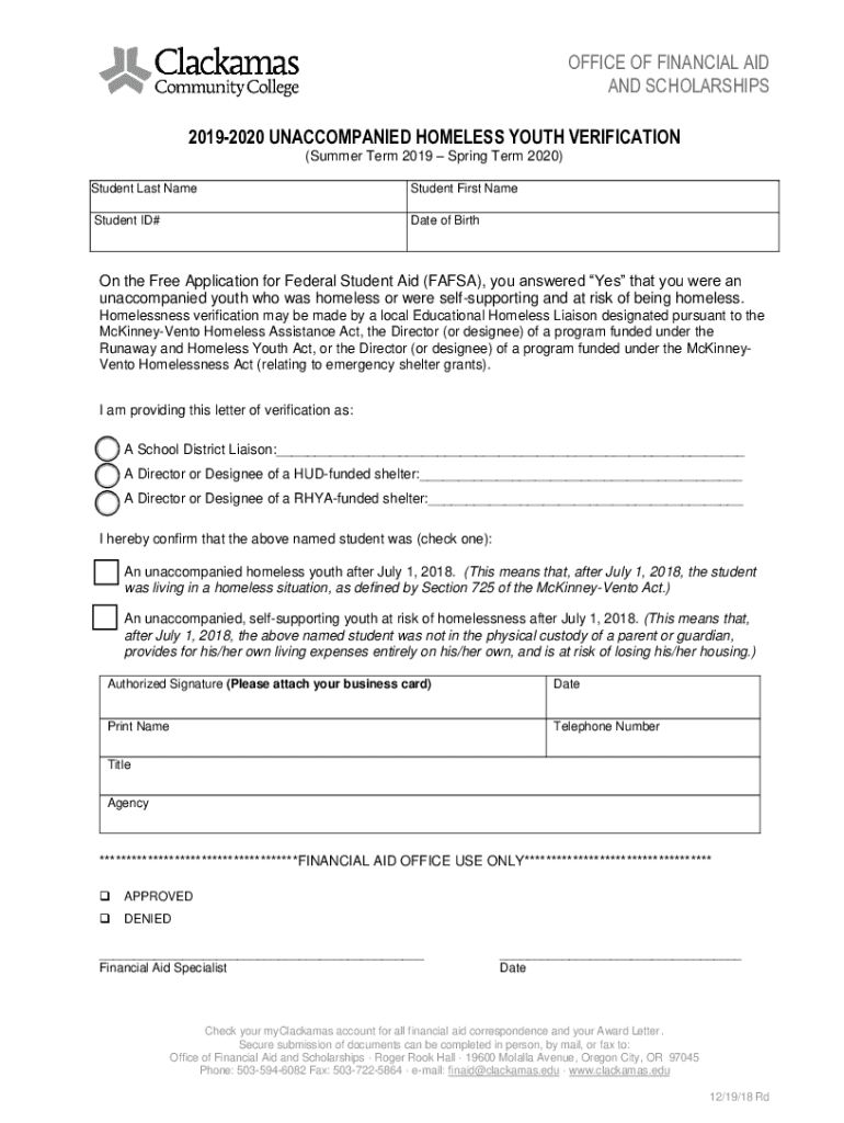 OFFICE OF FINANCIAL AID AND SCHOLARSHIPS 20192020 UNACCOMPANIED HOMELESS YOUTH VERIFICATION (Summer Term 2019 Spring Term 2020) Student Last NameStudent First NameStudent ID×Date of Birth the Free