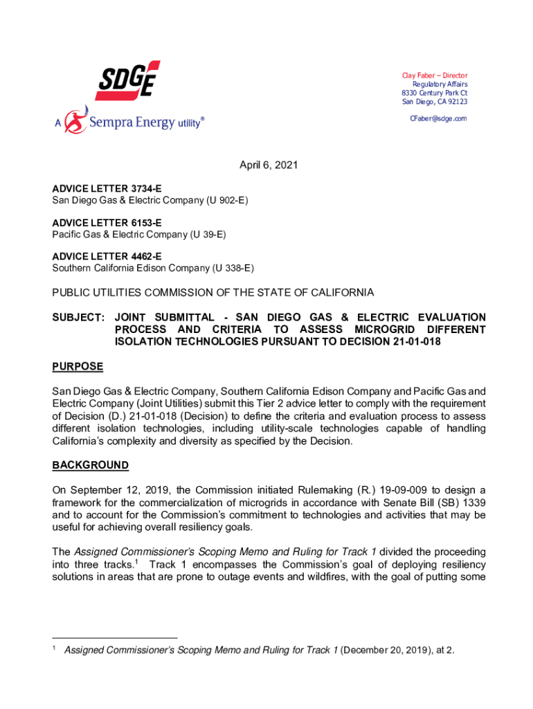 Clay Faber Director Regulatory Affairs 8330 Century Park Ct San Diego, CA 92123 Caber×sdge.com April 6, 2021, ADVICE LETTER 3734E San Diego Gas & Electric Company (U 902E) ADVICE LETTER 6153E Pacific