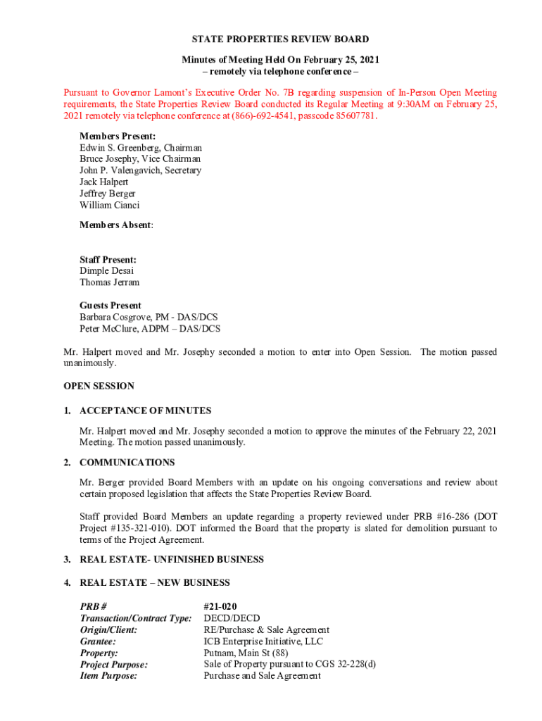 STATE PROPERTIES REVIEW BOARD Minutes of Meeting Held On February 25, 2021, remotely via telephone conference Pursuant to Governor Lamont's Executive Order No. 7B regarding suspension of Unperson