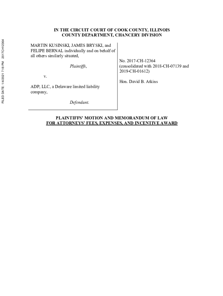 FILED DATE: 1/4/2021 7:18 PM 2017CH12364IN THE CIRCUIT COURT OF COOK COUNTY, ILLINOIS COUNTY DEPARTMENT, CHANCERY DIVISION MARTIN KAMINSKI, JAMES BRISK, and FELIPE VERNAL individually and on behalf