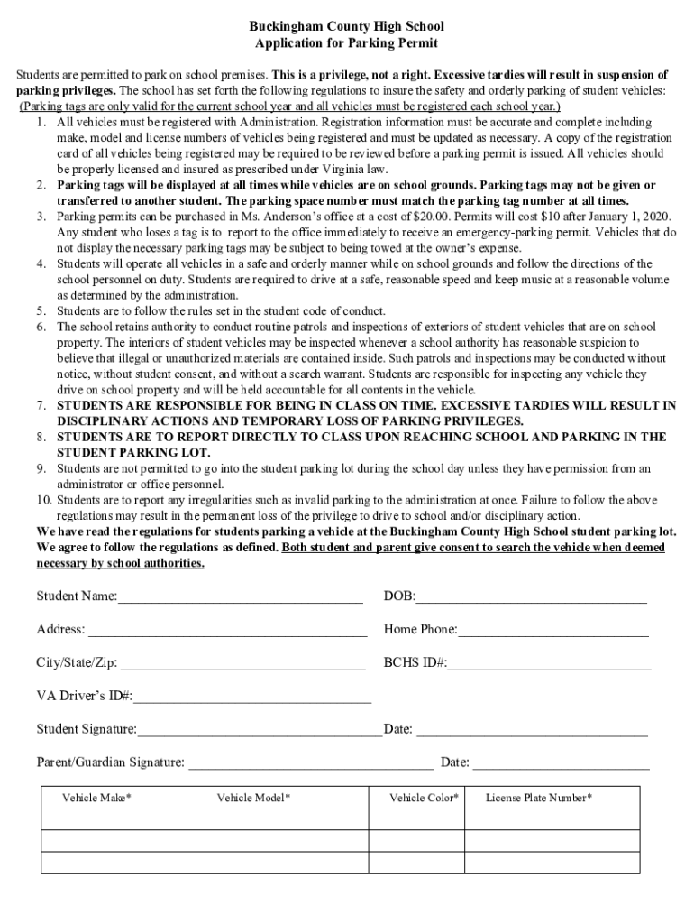 Buckingham County High School Application for Parking Permit Students are permitted to park on school premises. This is a privilege, not a right. Excessive tarries will result in suspension of parking