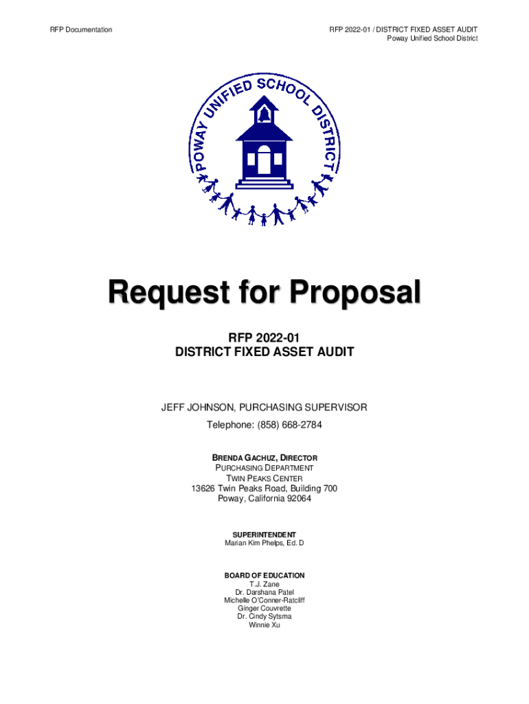 RFP Documentation RFP 202201 / DISTRICT FIXED ASSET AUDIT Noway Unified School DistrictRequest for Proposal RFP 202201 DISTRICT FIXED ASSET AUDITED JOHNSON, PURCHASING SUPERVISOR Telephone: (858)