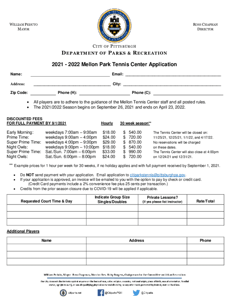 WILLIAM PEDRO MAYORESS CHAPMAN DIRECTOR I TED EPARTMENTOFOFP I T TS B U R G HP ARKS ECREATION2021 2022 Mellon Park Tennis Center Application Name:Email: ___ ___ City: ___Address: Zip Code: Phone (H):Phone