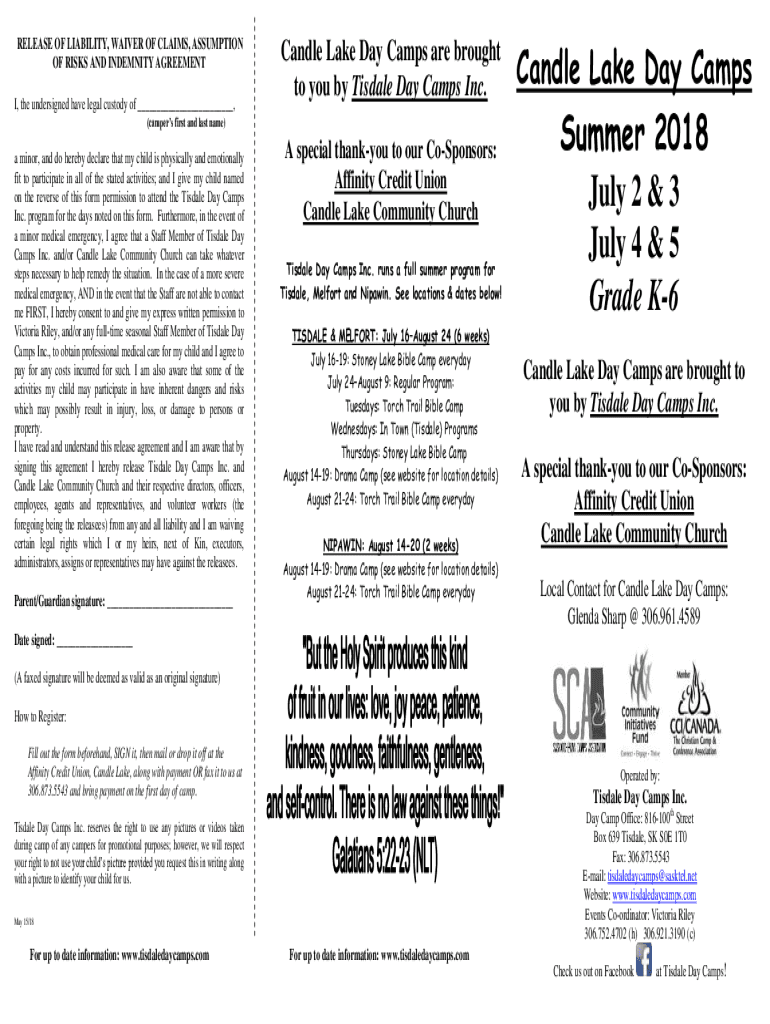 RELEASE OF LIABILITY, WAIVER OF CLAIMS, ASSUMPTION OF RISKS AND INDEMNITY AGREEMENT I, the undersigned have legal custody of ___, Candle Lake Day Camps are brought to you by Tisdale Day Camps Inc.(campers