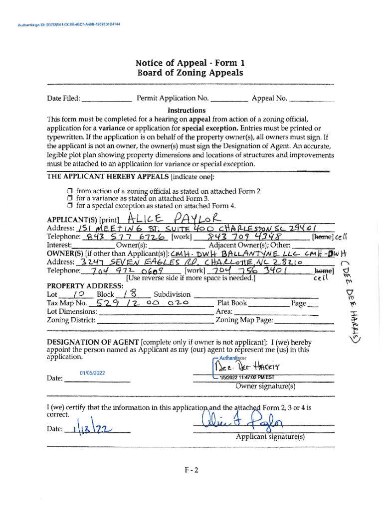 Authenticity ID : B37585A1CC8E4BC7A48B1957E31D4744Notice of Appeal Form 1 Board of Zoning Appeals Date Filed: Permit Application No. _ _ _ _ Appeal No. _ _ __ _Instructions This form must be completed