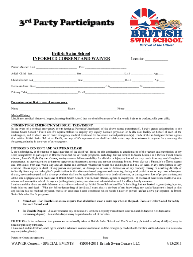 3rd Party Participants SPECIAL EVENT British Swim School INFORMED CONSENT AND WAIVERLocation ___Parents Name: Last ___ First ___ Added. Child: Last___ First ___ D.o. B ___ Age ___ Child's Name: Last___