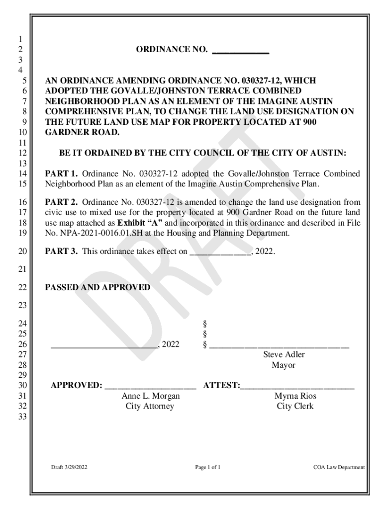 1 2 3 4ORDINANCE NO. ___5 6 7 8 9 10 11 12 13 14 15AN ORDINANCE AMENDING ORDINANCE NO. 03032712, WHICH ADOPTED THE GOALIE/JOHNSTON TERRACE COMBINED NEIGHBORHOOD PLAN AS AN ELEMENT OF THE IMAGINE AUSTIN