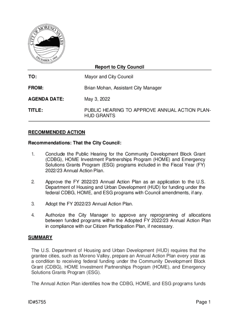 Report to City Council TO:Mayor and City Councilor:Brian Moran, Assistant City ManagerAGENDA DATE:May 3, 2022TITLE:PUBLIC HEARING TO APPROVE ANNUAL ACTION PLAN HUD GRANTSRECOMMENDED ACTION Recommendations: