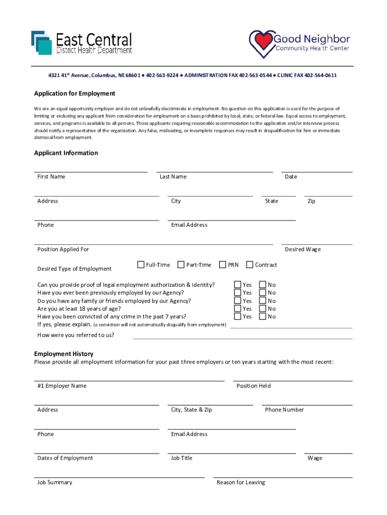 4321 41st Avenue, Columbus, NE 68601 4025639224 ADMINISTRATION FAX 4025630544 CLINIC FAX 4025640611Application for Employment We are an equal opportunity employer and do not unlawfully discriminate