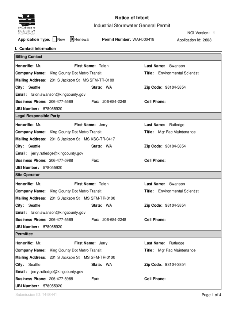 Notice of Intent Industrial Stormwater General Permit NOI Version: 1 Application Type:New RenewalPermit Number: WAR000418Application I'd: 2808I. Contact Information Billing Contact Honorific: Mr.